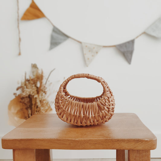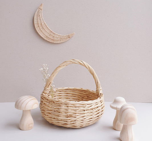 Kids Wicker Basket with Handle and 1 Wooden Mushrooms Ais-Charming Round Rattan Basket with Handle & Handmade Wooden Mushrooms