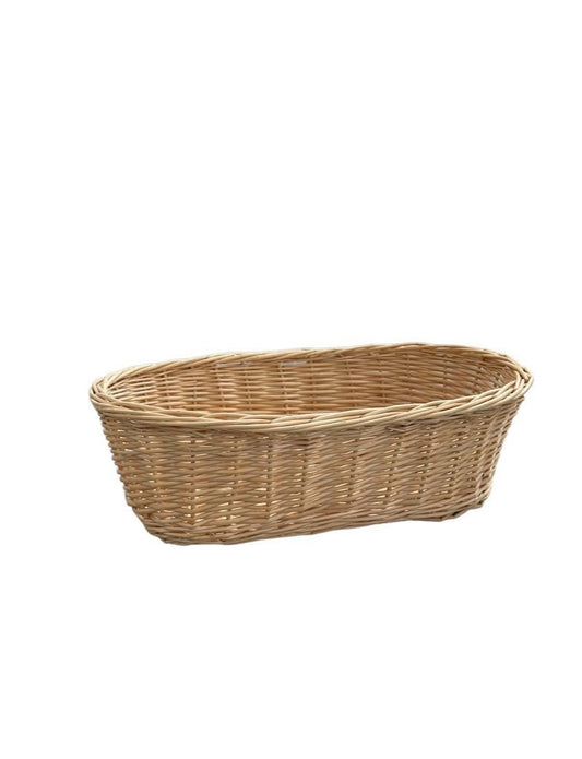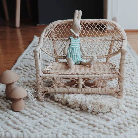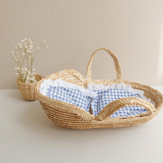 Rattan Doll Bed with Washable Blue Vichy Linen & 2 x Cushions – 31cm Long